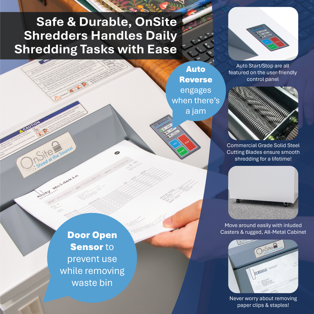 The Formax FD 8304CC Deskside Shredder delivers secure document destruction in a compact format that fits neatly into office or home environments. Built with commercial-grade components such as an all-metal cabinet on casters, a heavy-duty AC geared motor, and a lifetime-guaranteed waste bin, it offers durability that supports frequent use. Its heat-treated steel blades cut documents into small 1/16″ x 19/32″ particles, ensuring sensitive information remains protected.